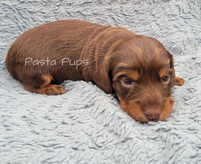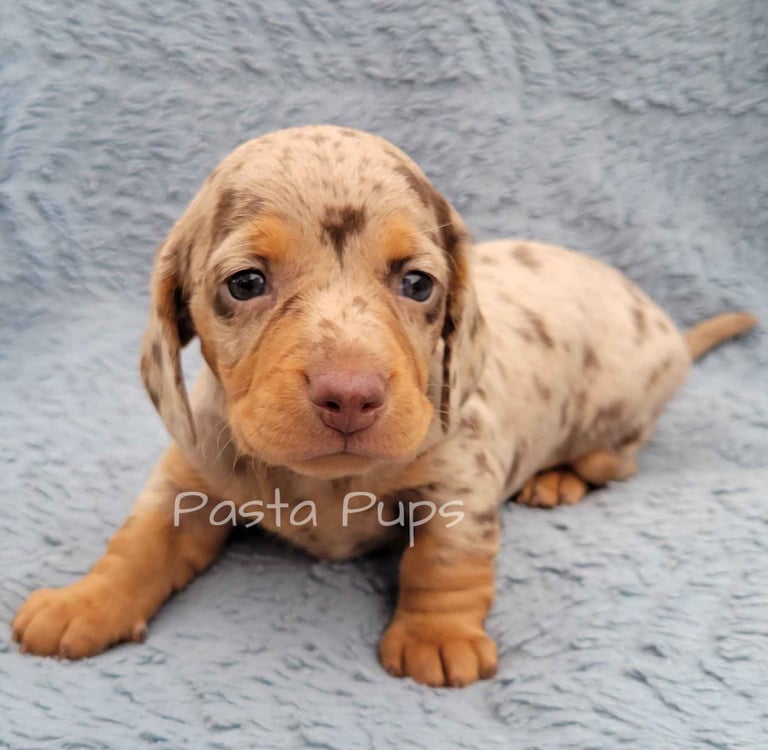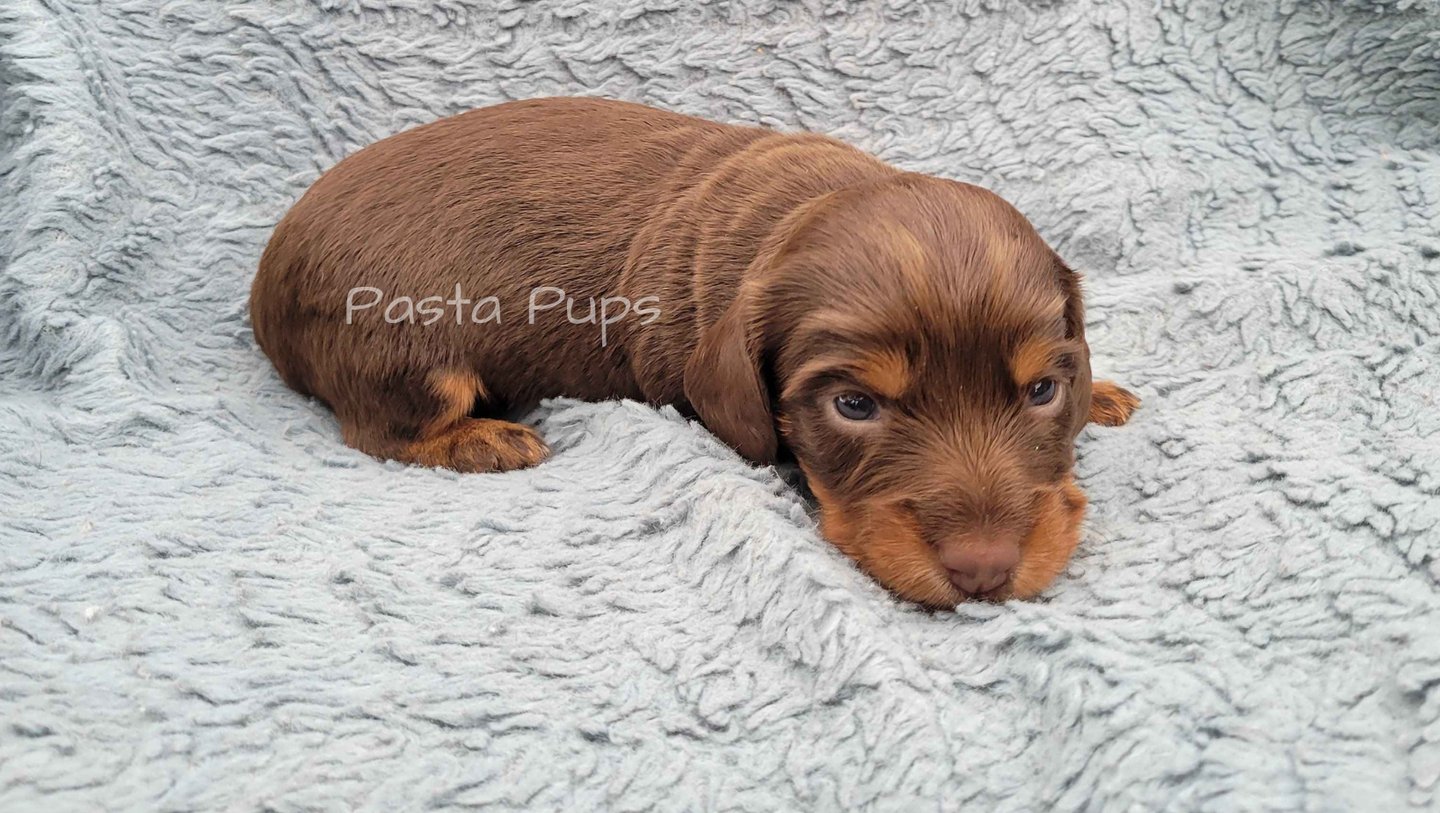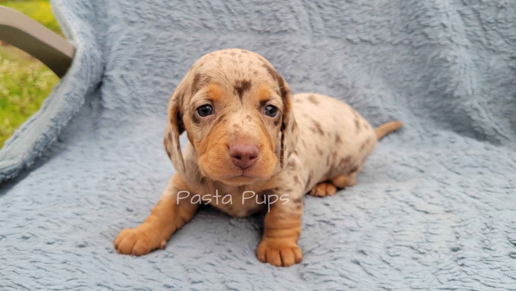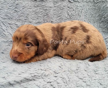 Ready May 9th! His parents are Chelli and Tag. He is a smooth coat chocolate dapple and the largest in the litter.